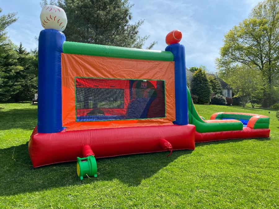The Dual Sports Wet or Dry is a bounce house waterslide combo that can instantly be used as a dry combo as well. The combo is safe for all ages to use with water and or bounce around. The Dual Sports Wet or Dry Combo also features a basketball hoop inside to add to the fun.