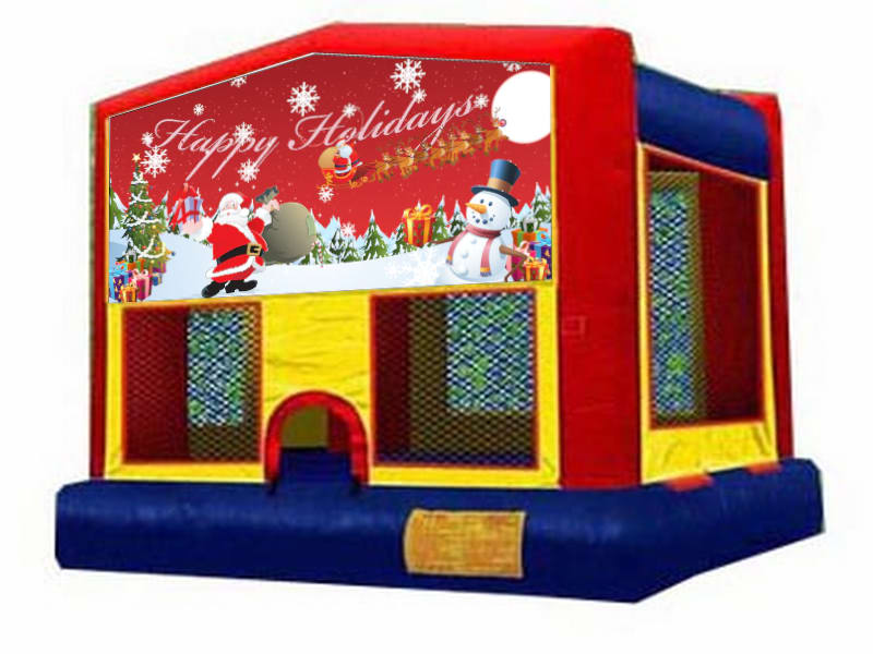 This colorful inflatable features a large bounce area and a basketball hoop.