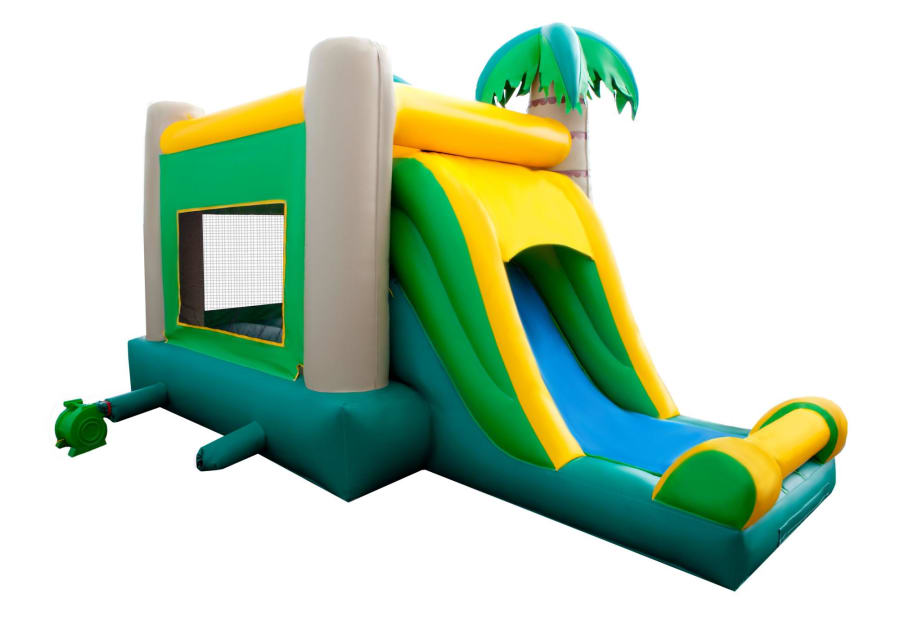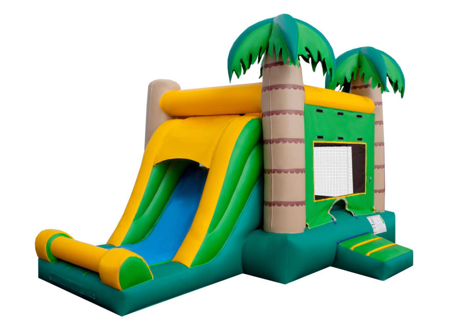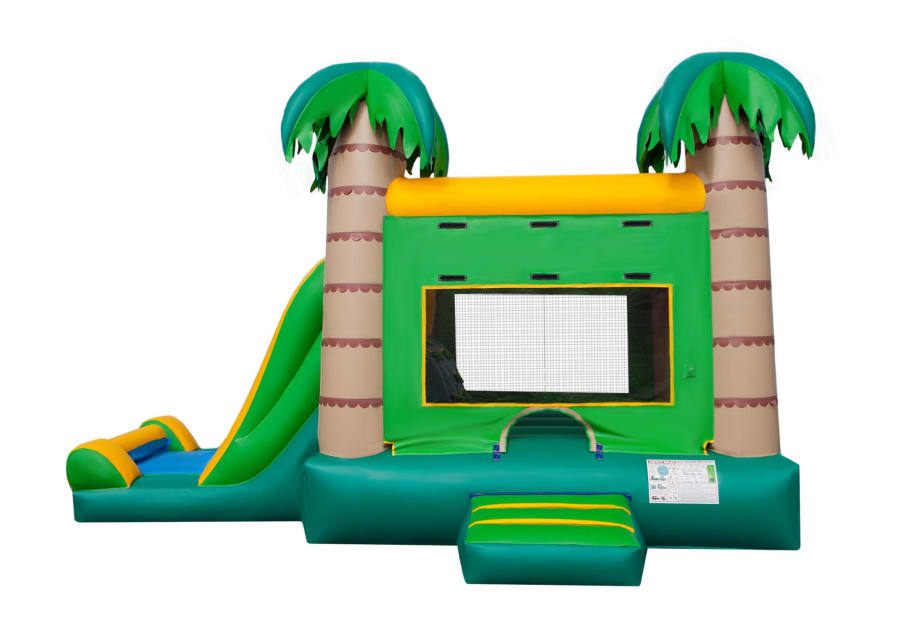 The Tropical Combo with a green, yellow and brown tropical color theme and palm trees will sure to bring a cool breeze of enjoyment to any event. The ride consists of a 13'x13' bounce house with a basketball hoop and ends with a 6-foot tall slide out to the side