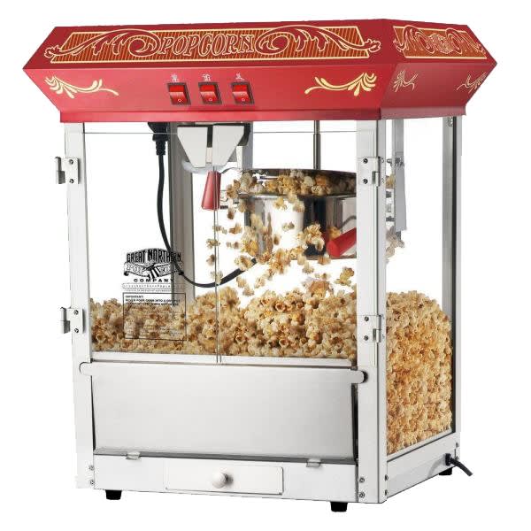 This commercial popcorn machine can produce nearly 2 gallons of popcorn per batch. Great for backyard parties or smaller events. Unit is 26” tall x 21” wide x 18” deep Weight is 34 lb.