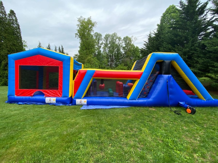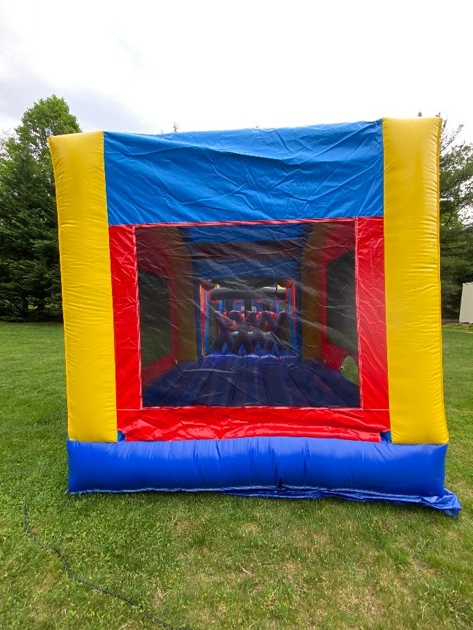 Coming in late Spring 2024 is the 45' Bounce House Obstacle Course which combines two of the most popular inflatable actions, bouncing around and racing one another, into one inflatable ride. The 45 foot long Bounce House Obstacle is a good sized inflatable for riders to enjoy both a spacious 11'x13' bouncing area, along with a well sized 32 foot long obstacle course. Riders first enter the bounce house where they can bounce around and have a good time. From the bouncer riders can hop over to the obstacle course and race one another through the popups, crawl throughs, and finally finish off on the climber and slide. A great inflatable that combines both components in one in a safe and fun manner.